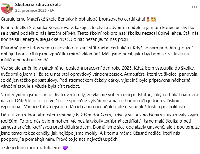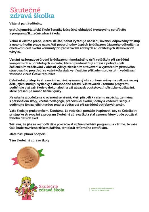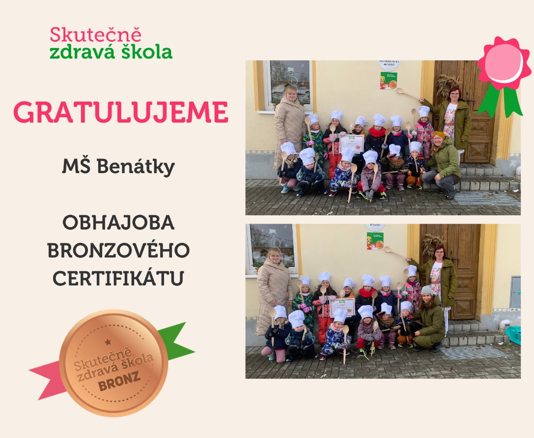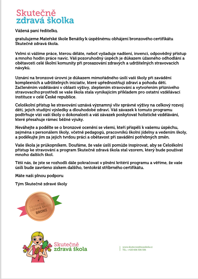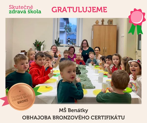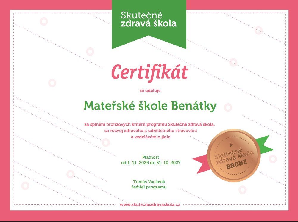 V listopadu 2025 se naší mateřské škole opět podařilo obhájit bronzový certifikát v projektu, "Skutečně zdravá školka". Děkujeme rodičům za podporu a spolupráci.